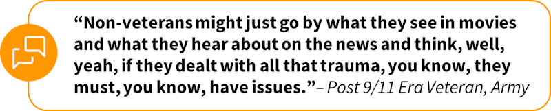 Veterans’ other top mentions were community involvement and volunteering, as well as facilitating civilian transition. Non-veterans’ other top mentions were support through community resources and advocacy and government responsibility.