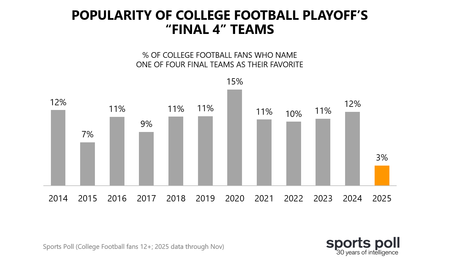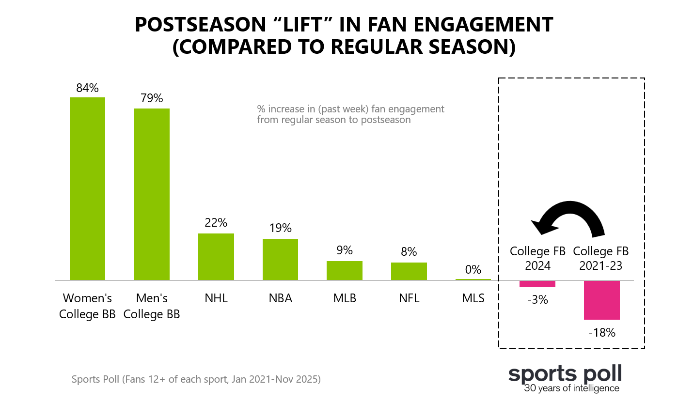 In 2024, the Playoff expanded to 14 teams, and Sports Poll showed the immediate impact. We measure “fan engagement” as the number of fans who follow the sport in some way during the week (view, attend, read, social media, etc.).