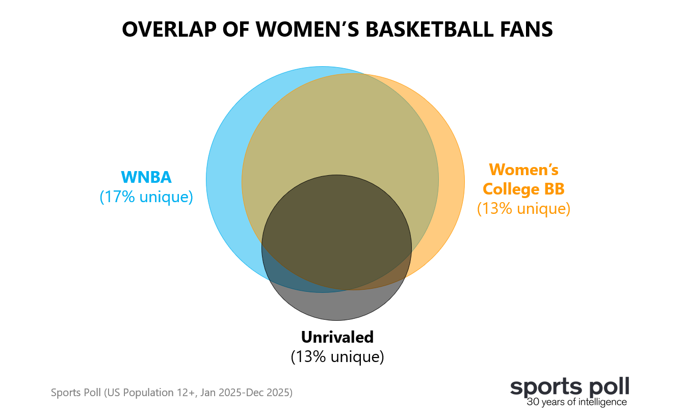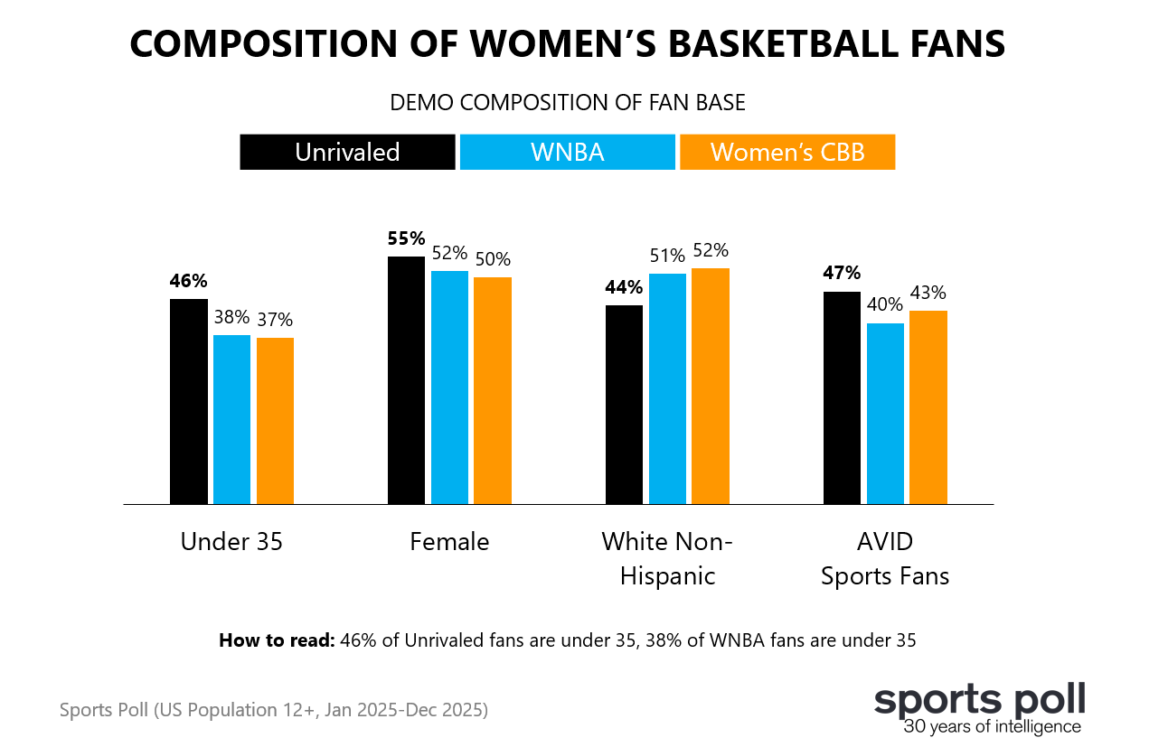 What does Unrivaled add to the women’s basketball landscape? The WNBA and women’s college basketball have the two largest fan bases of any women’s leagues in the US today. While most Unrivaled fans (those at least a little bit interested) are already fans of either the WNBA or women’s college basketball, early signs show that Unrivaled can extend the reach of women’s basketball. Sports Poll data showed that 13% of fans were only fans of Unrivaled in 2025. Among AVID fans (very interested), it’s even higher. Over 1/3 were only AVID fans of Unrivaled last year. The Unrivaled fan base skews younger and more female than WNBA or women’s college basketball fans. It’s also more diverse.