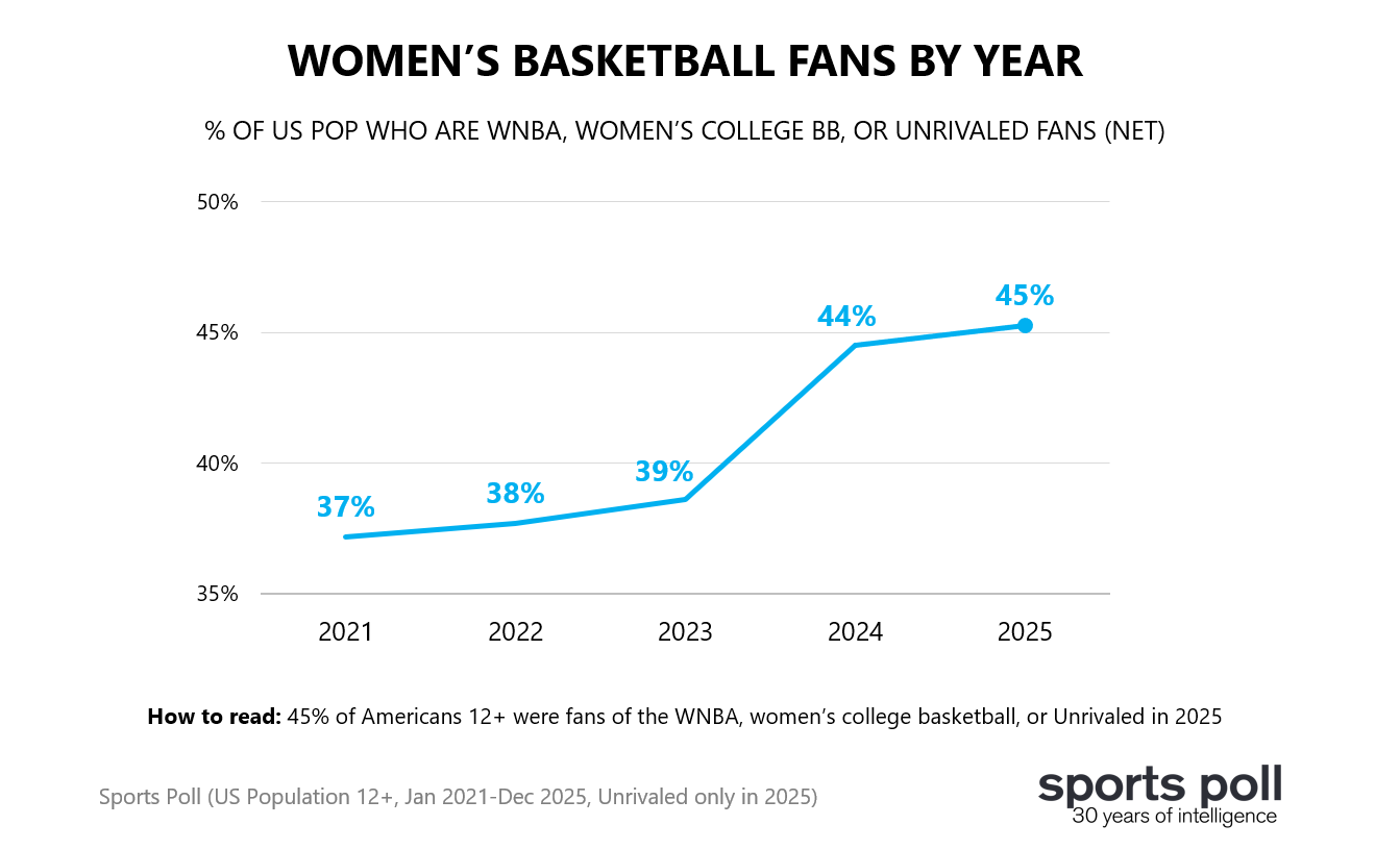 Last year’s launch arrived at a watershed moment for women’s basketball. Sports Poll data showed unprecedented fan base gains for both the WNBA and women’s college basketball in 2024, driven by the emergence of Caitlin Clark and Angel Reese.