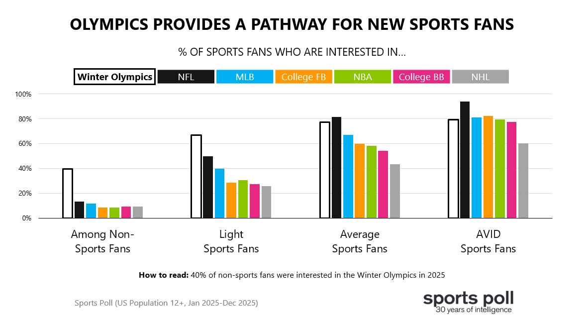 With the 2026 Winter Olympics starting this week, it’s the perfect time to recognize the unique value of the Games. More than any other sports property (league or event), interest in the Olympics extends to non-sports fans and light sports fans. This has held true since Sports Poll began tracking interest in the Games more than 30 years ago. Among the best (AVID) sports fans, interest is highest in the NFL and similar for the Olympics, MLB, college football, college basketball, and the NBA. Average sports fans are slightly more interested in the NFL than the Olympics. It’s a different story for light fans and non-fans where interest is significantly higher for the Olympics than the major US sports (all data from Sports Poll, Jan 2025-Dec 2025).